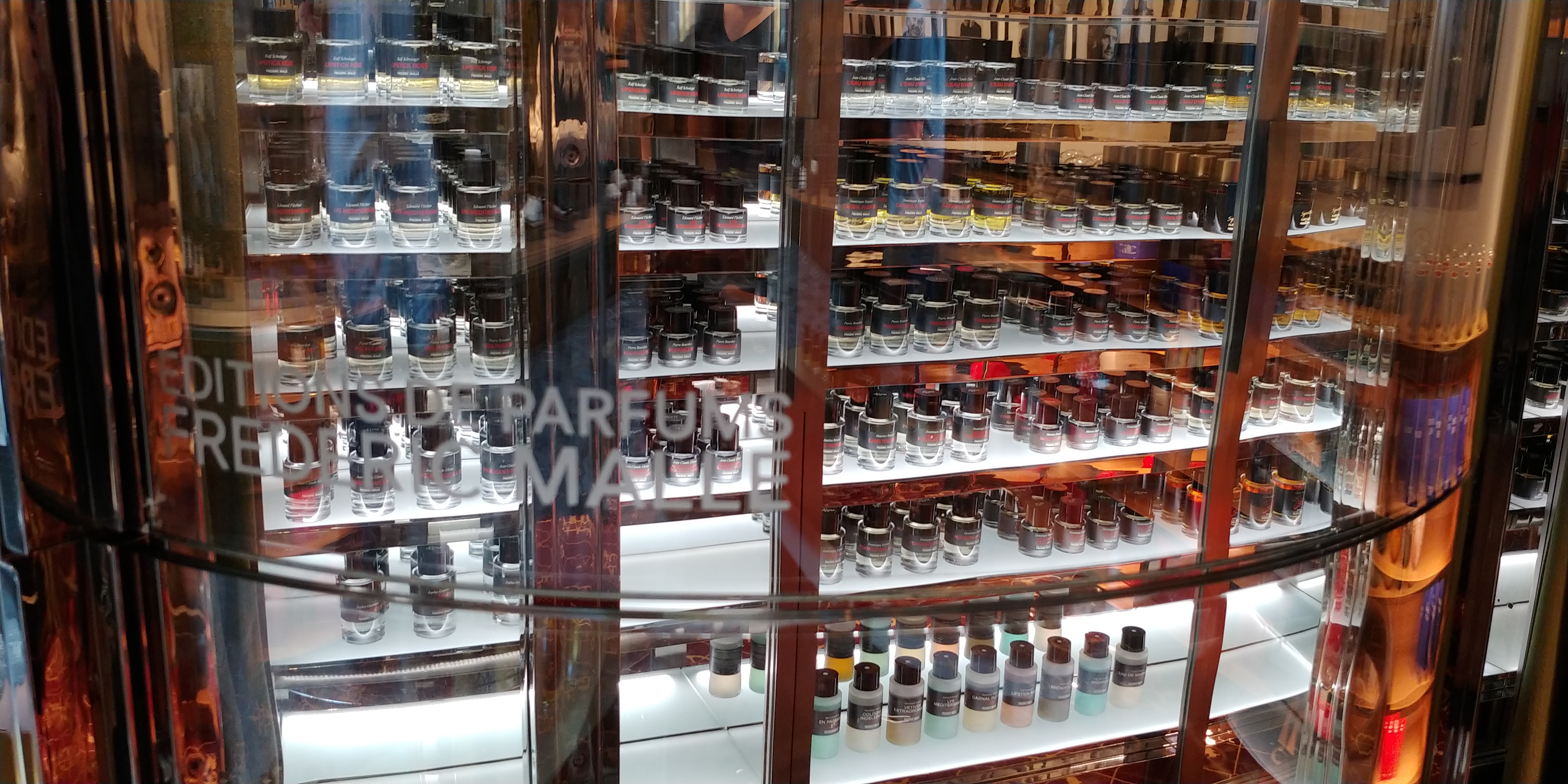 Then I started chatting with a friendly sales associate who was very earnest about fragrance—he explained that Jovoy allowed them to make [their interactions with customers] “more about the journey” rather than pressuring them to sell any particular brand. He introduced me to an exquisite range of artistic perfumes and showed me their collection of ambergris—both “white gold” and “black gold”—housed in bell jars.