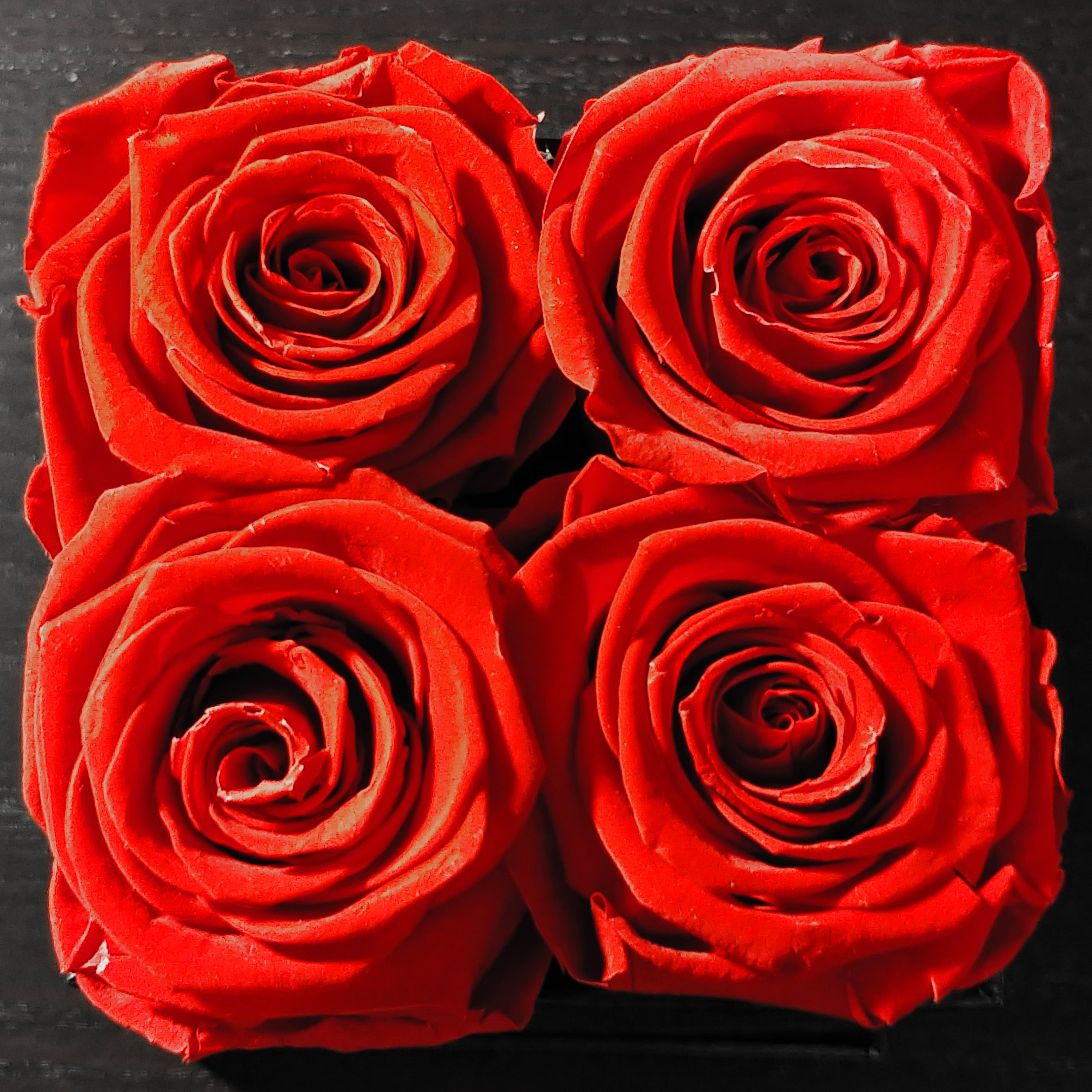 When I opened my eyes, there it was: a black hat box containing four bright red roses. I was surprised how uniformly red they were, but didn’t immediately wonder why. And how concentrated the fresh petal aroma was! At first I thought it could only be smelled when I got close, but within about an hour, it had permeated the whole apartment.