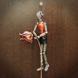 This year, my Halloween decoration is a dressed-up wire woman holding a wilted rose. She is wearing a miniskirt, but that is only because I ran out of ribbon to upcycle. I’m working with what I’ve got here. Her “male” counterpart is busy guarding perfumes in a small display case.