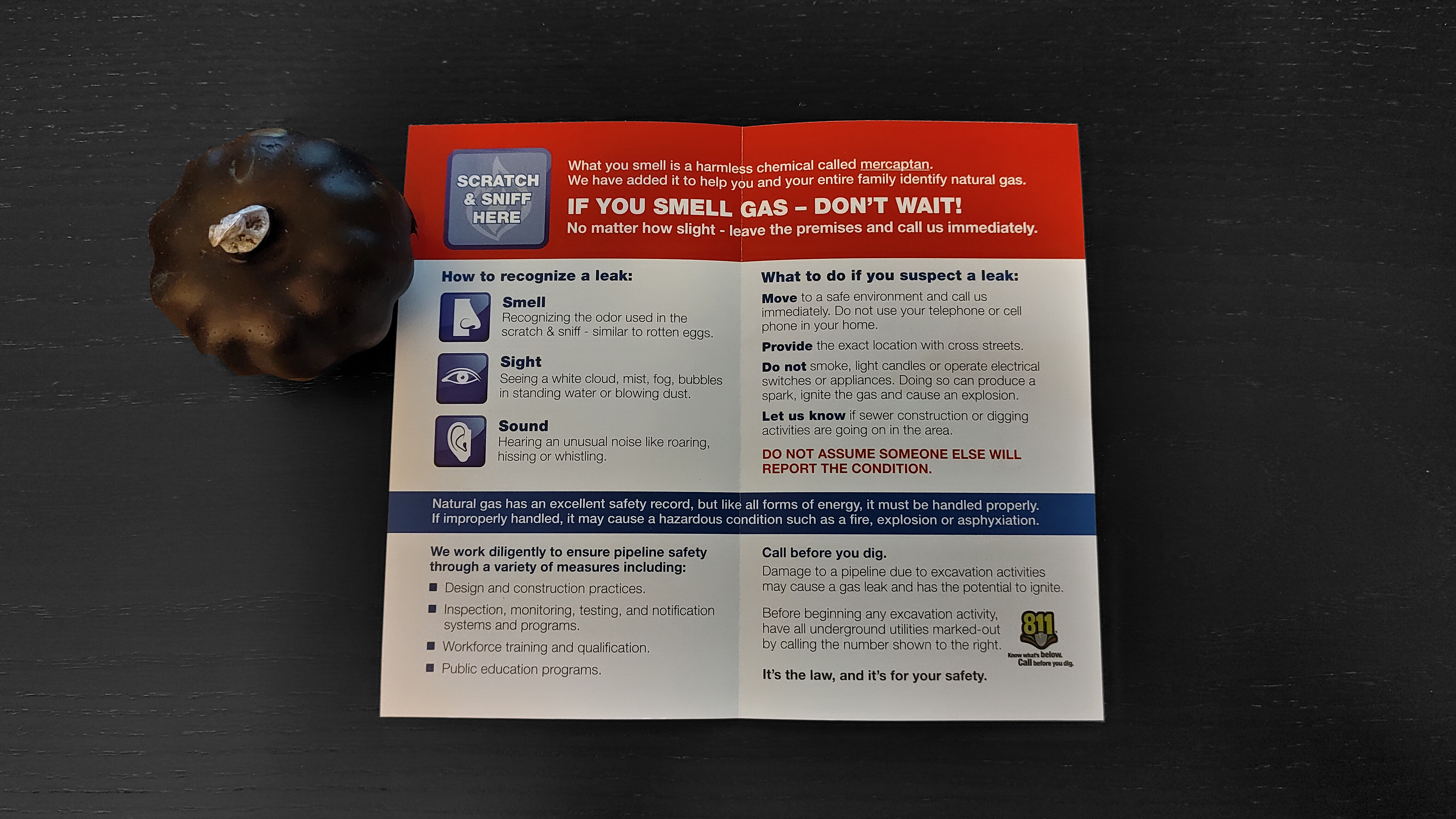 It turned out to be a scratch & sniff to remind the public of the smell of mercaptan, which is added to odorless natural gas lines as an olfactory marker that most people can identify quickly. You can’t run this campaign virtually.