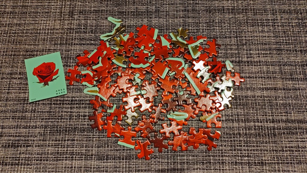 Encountered this today: a Little Puzzle Thing® limited-edition jigsaw puzzle from their Smells series that includes a scratch-and-sniff sticker for each design! It includes “more than 70 pieces” and took my other half and me almost 40 minutes to complete together. (We thought it would take far less time, because a similar puzzle with a picture of popcorn had the caption “ready in 20 minutes.”) But a rose is more complex than popcorn, isn’t it?