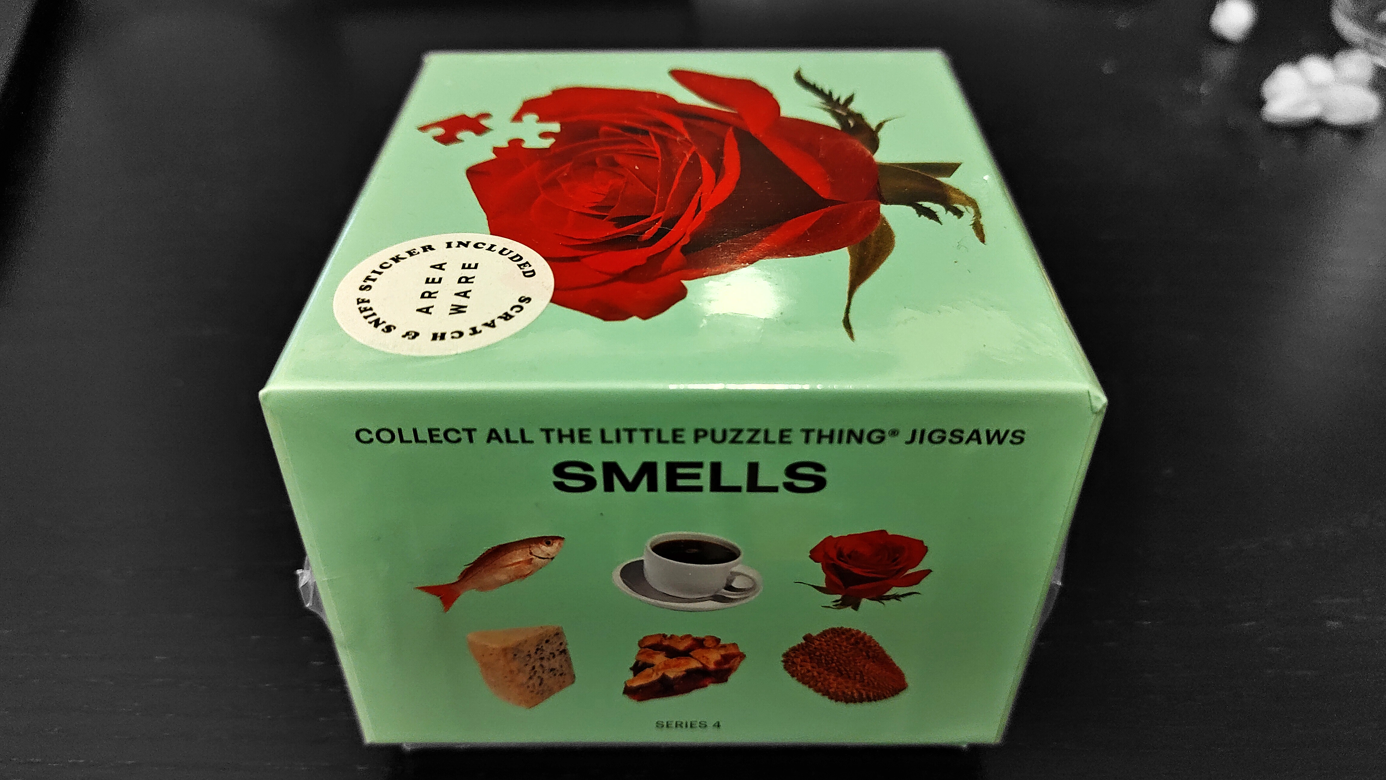 Encountered this today: a Little Puzzle Thing® limited-edition jigsaw puzzle from their Smells series that includes a scratch-and-sniff sticker for each design! It includes “more than 70 pieces” and took my other half and me almost 40 minutes to complete together. (We thought it would take far less time, because a similar puzzle with a picture of popcorn had the caption “ready in 20 minutes.”) But a rose is more complex than popcorn, isn’t it?
