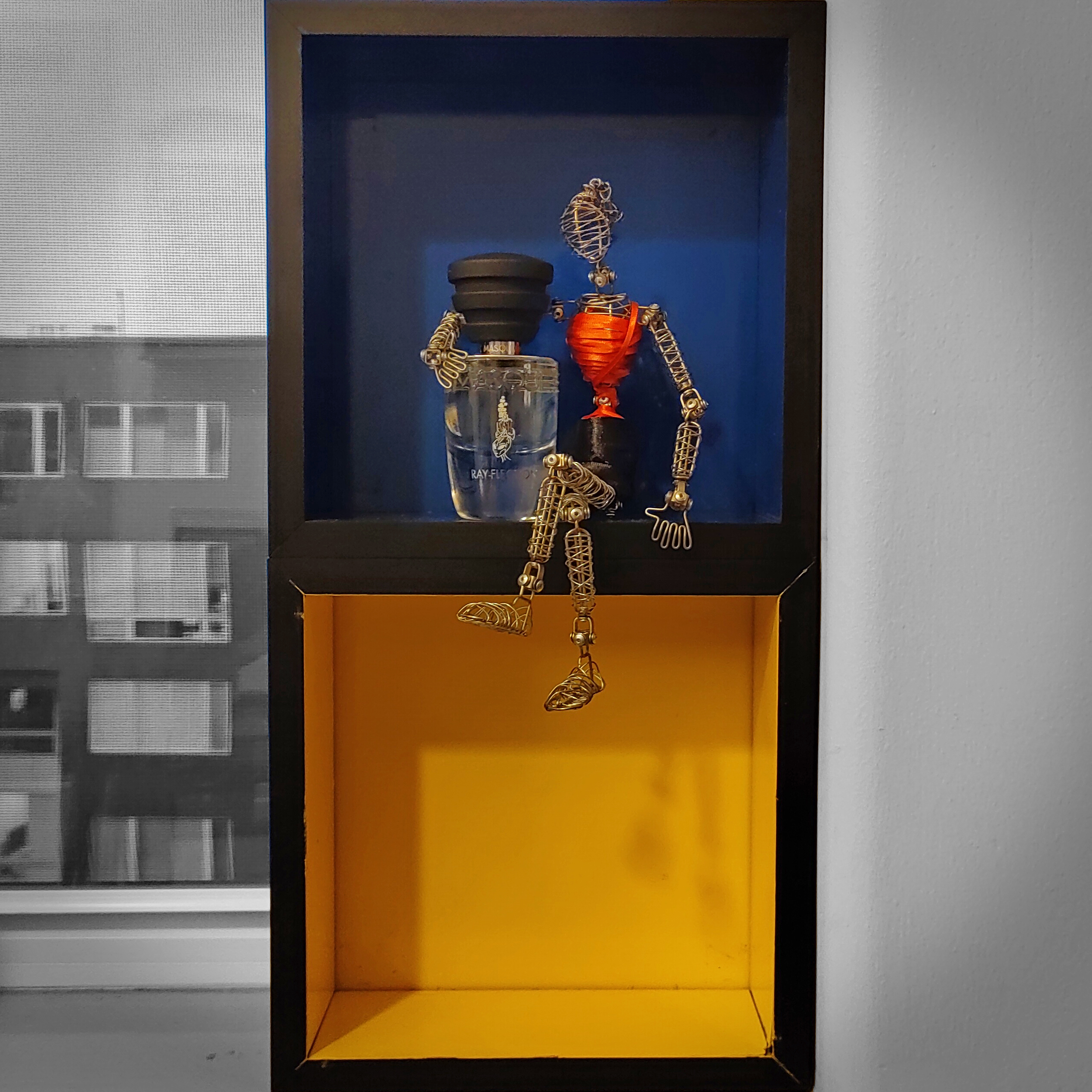 Today, March 21, is International Fragrance Day. I’m not feeling particularly photogenic these days, and certainly not today after the strong wind had a go at my hair (“March comes in like a lion…”), so my new perfume love Masque Milano Ray-Flection is featured here with a wire stand-in for my #smellfie. Eve™ the Doodles® Woman is still dressed in ribbons from 2 Halloweens ago.
