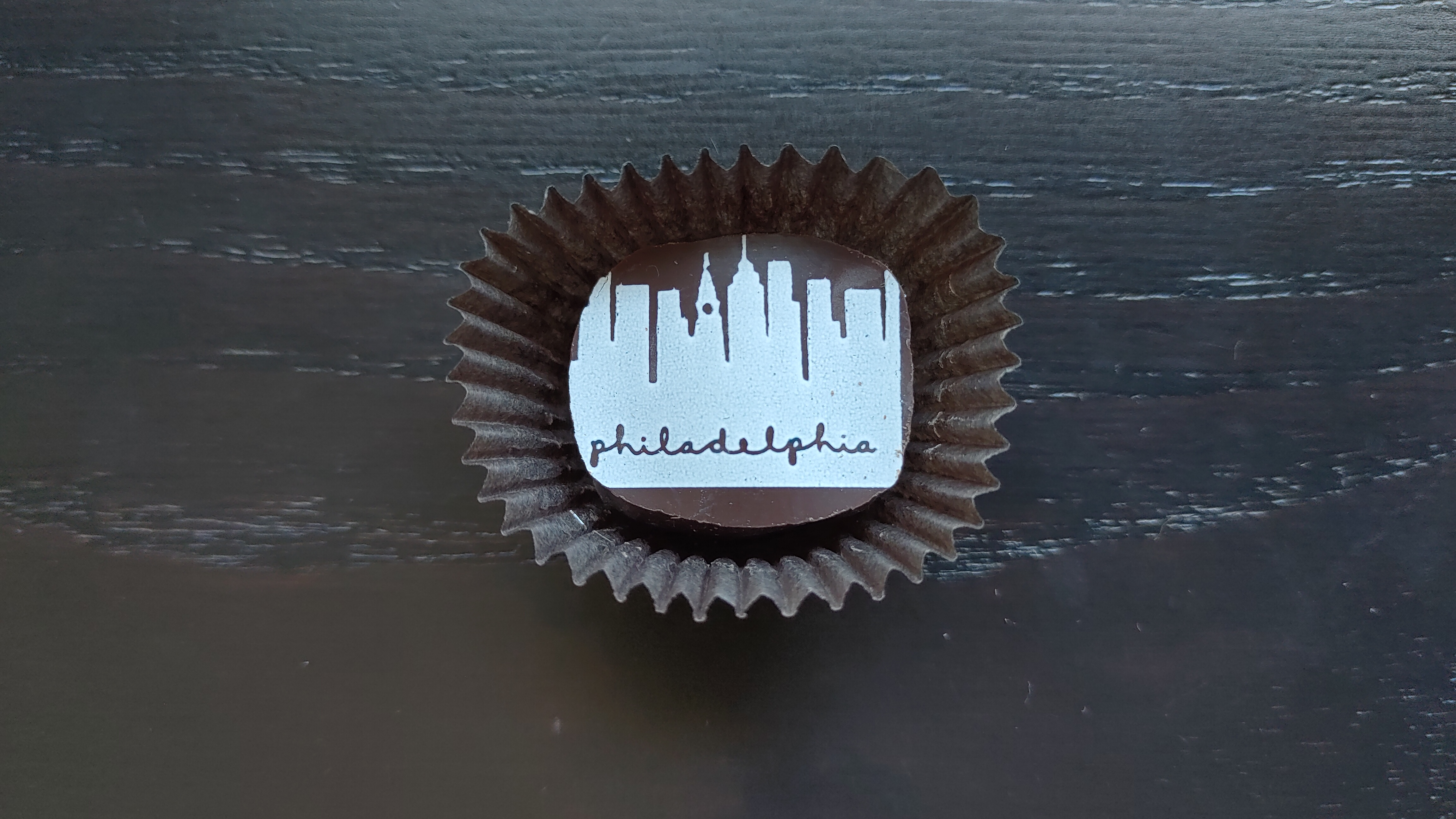 “Philly Skyline/Phanatic” by Marcie Blaine Artisanal Chocolates—this one is a crispy hazelnut praline