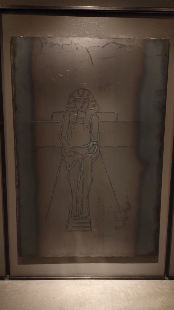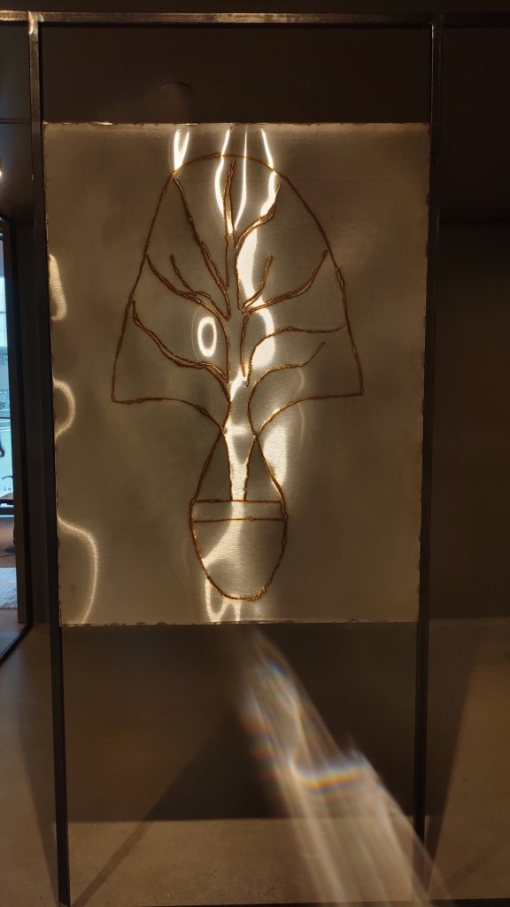 As a lover of wire art and the minimalist aesthetic, I also appreciated the steel frameworks, which were based on the floor plan of the Nubian deity Dedwen’s birth house. Other references to history and mythology were drawn using MIG and TIG welding techniques to sketch figures onto stainless steel panels.