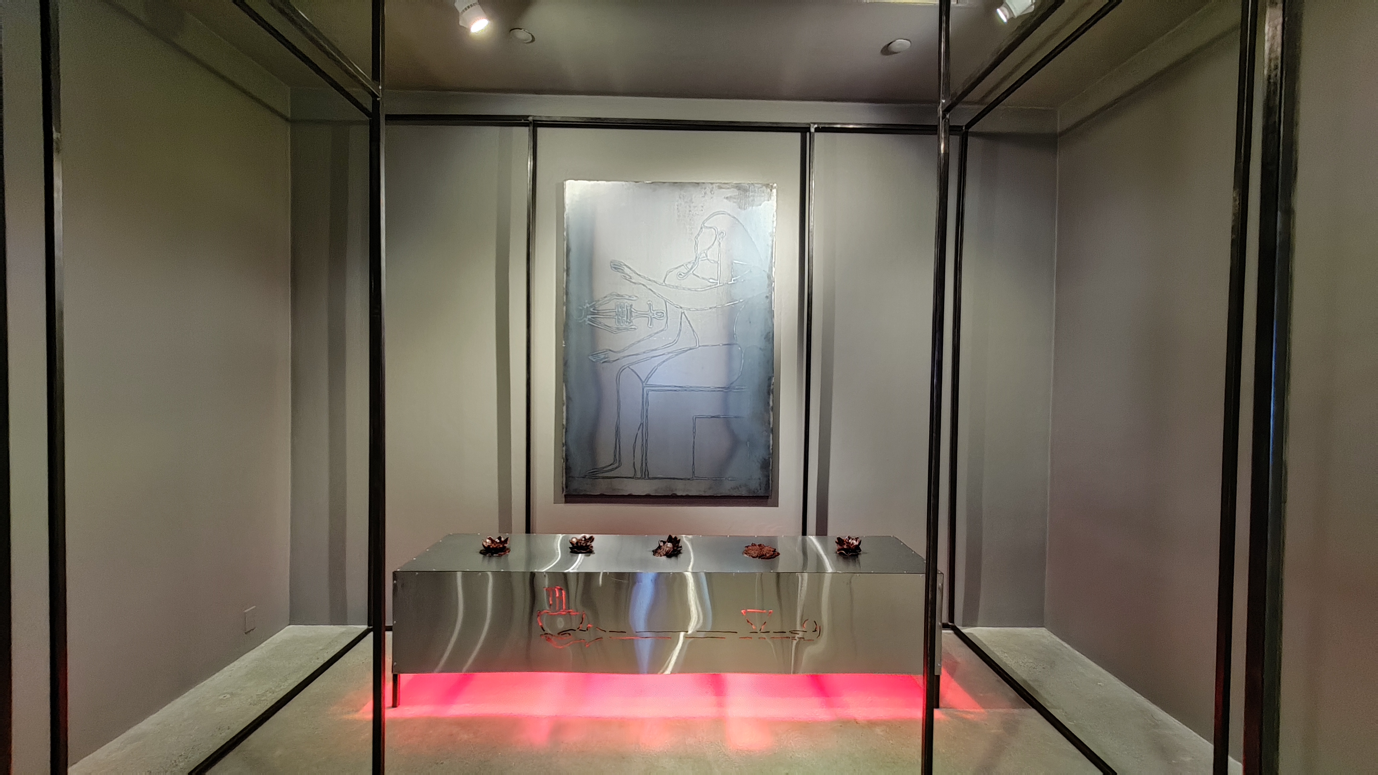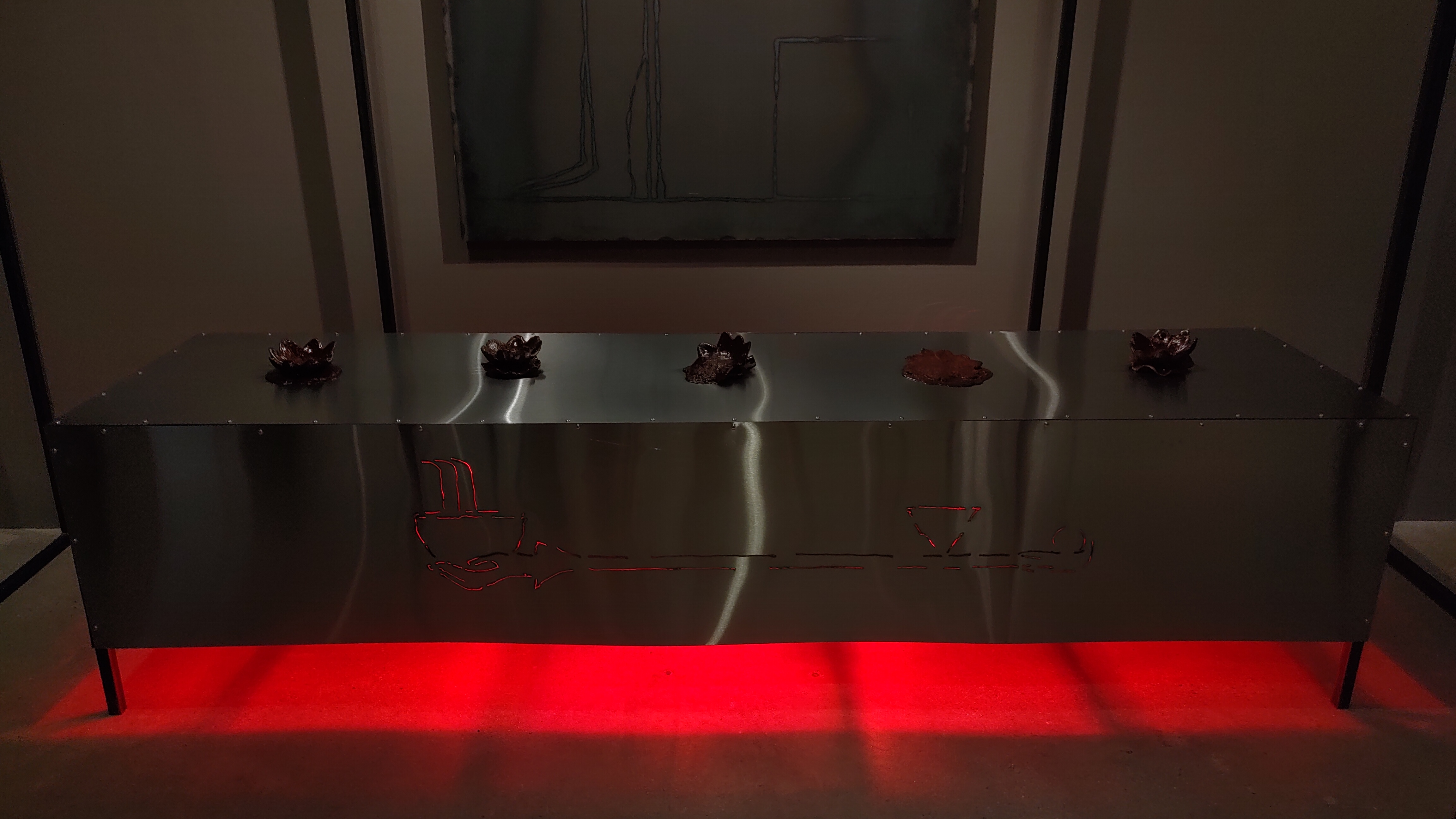 The altar is built of stainless steel with cutout designs illuminated by heat lamps underneath, which not only enhance the ambience with a red glow but serve to slowly melt the bukhoor, which is bound together with sugar. Five bukhoor sculptures in the shape of waterlilies appear to be in various stages of dissolution.