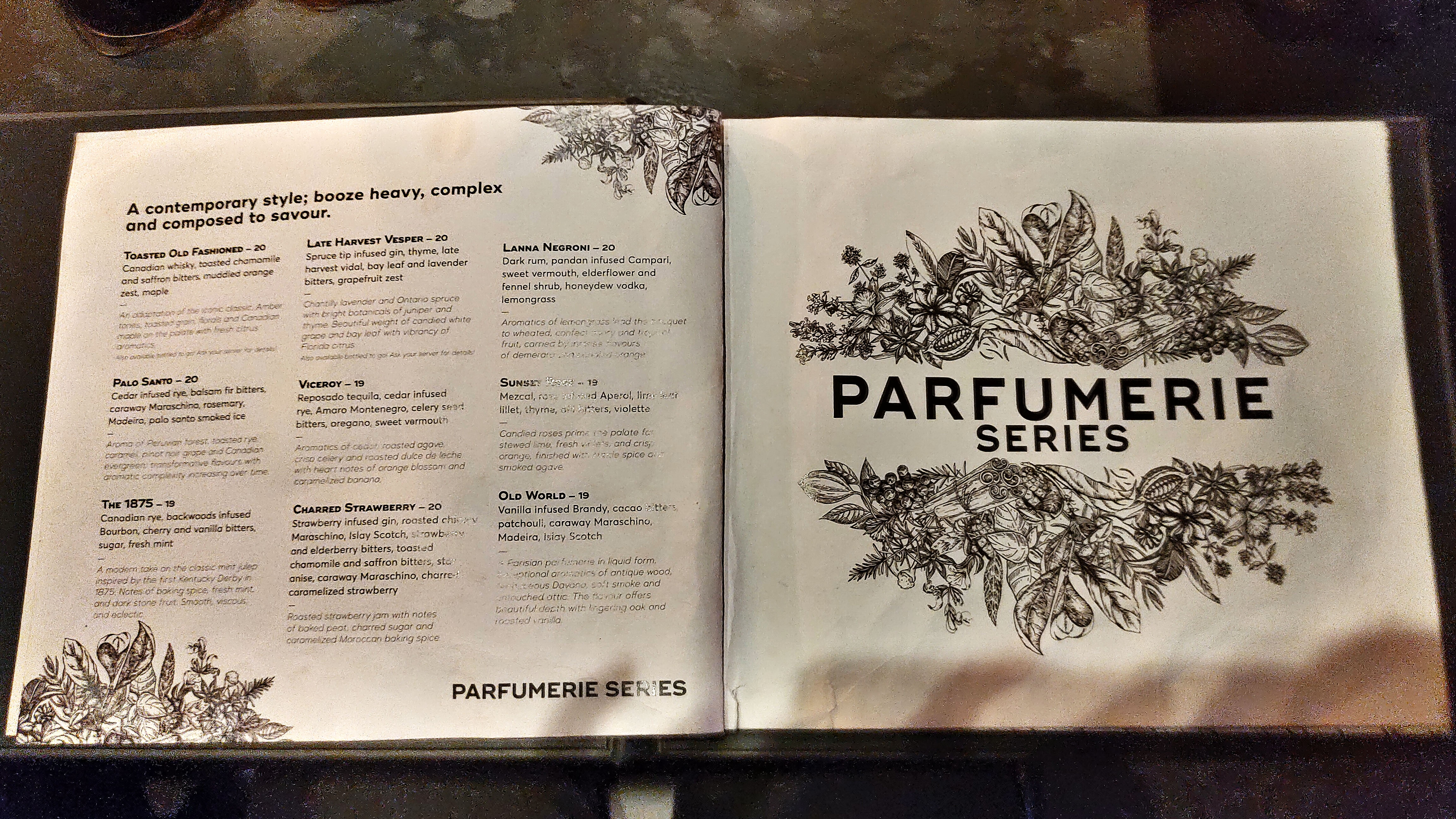 How could I resist these descriptions? “Old World”: A Parisian parfumerie in liquid form. Exceptional aromatics of antique wood, herbaceous Davana, soft smoke and untouched attic. The flavour offers beautiful depth with lingering oak and roasted vanilla. I first fell for “Sunset Rose” for its ingredient list of Mezcal, rose-infused Aperol, lime leaf, lillet, thyme, dill bitters, violette; it did not disappoint.