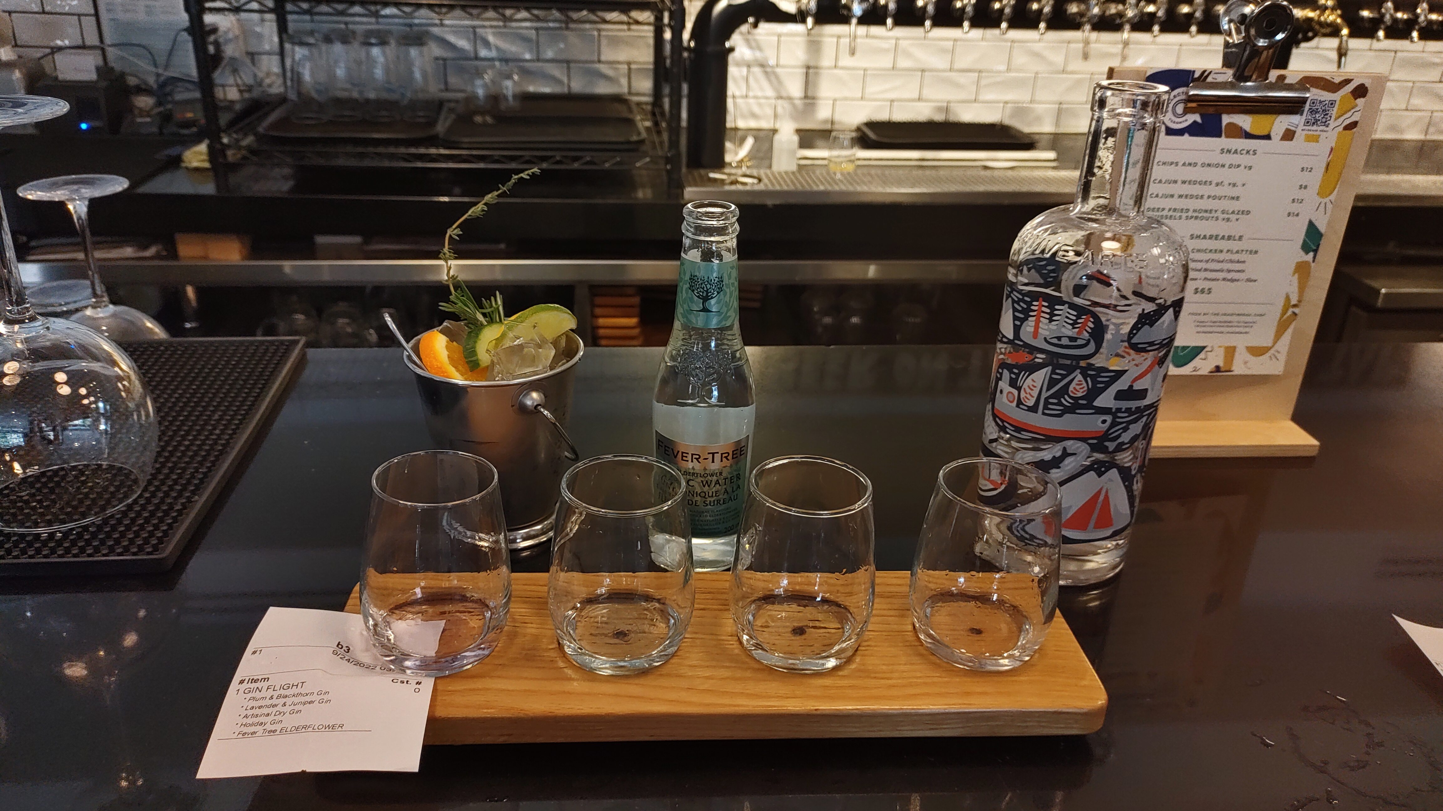 While strolling along the well-trafficked Dundas Street, we passed the taproom of Collective Arts Brewing, whose beers and gins are also distributed in the United States. After a brief dilemma, we decided to stop in and try a flight (beer for my other half and gin for me). The gins had some intriguing flavors—plum and blackthorn; lavender and juniper; orange, cocoa, and coffee (holiday gin)—although none of them surpassed the rhubarb and hibiscus for me. The experience was a treat, though, as I was supplied with a pail of garnishes and my choice of tonic to make my own mini G&Ts!