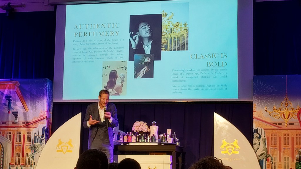The first scheduled in-person event was a masterclass by Parfums de Marly, featuring an “olfactive menu” of 10 perfumes. To follow along, you had to buy a discovery set for $50, which could be applied toward a purchase later. We decided to pass as I was not in the mood to buy another discovery set.
