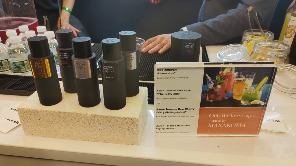 The anticipation was prolonged by standing in a long line outside the building waiting for the doors to open to those of us who weren’t press attendees. The waiting was compensated by being handed drink tickets at check-in, which we promptly used at the fragrant bar sponsored by Maxaroma. It was a fine idea to pair cocktails with perfumes by Precious Liquid (Iced Juniper) and Aaron Terence Hughes (Boss Bitch, Raw Cherry, and Notorious). The execution of the idea was a bit more challenging, as the bar area was very crowded and it was virtually impossible to sniff and sip at the same time. The drinks were all on the sweet side, and we liked the rum-based concoctions best.