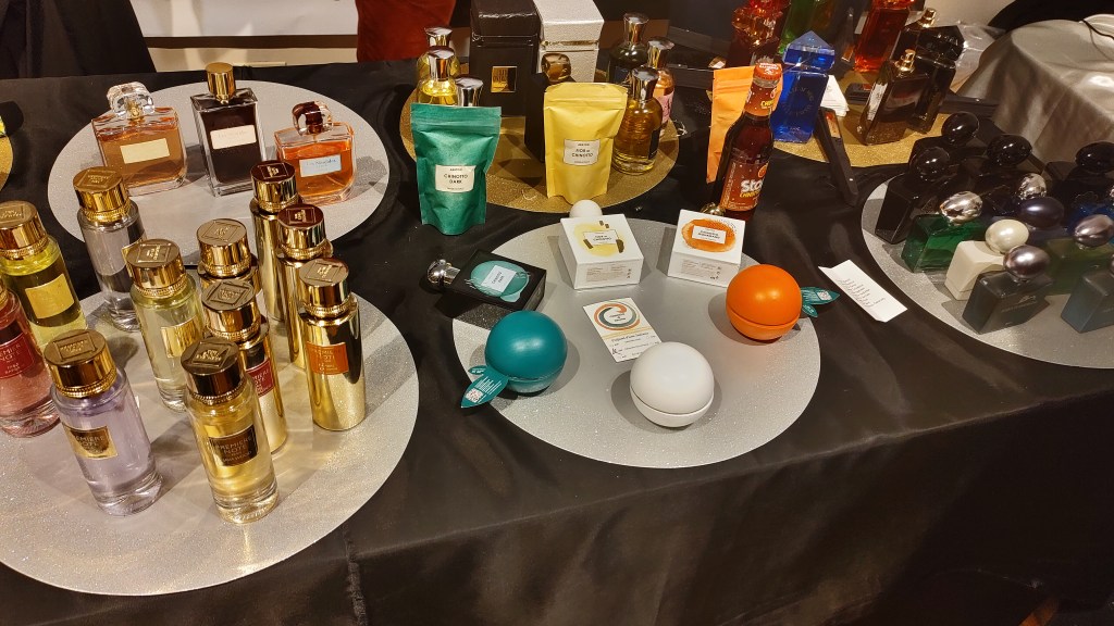 Most scheduled sessions started at least half an hour late, allowing plenty of time to explore the brands’ booths. Kajal greeted us with perfumed fabric flowers fashioned into rings—the first was Lamar, which smelled immediately like a piña colada to me and indeed features a prominent pineapple note before revealing a floral amber. This one was so strong that unfortunately I don’t remember what the other 3 I smelled were like, and the scent is mostly gone from the rings now.