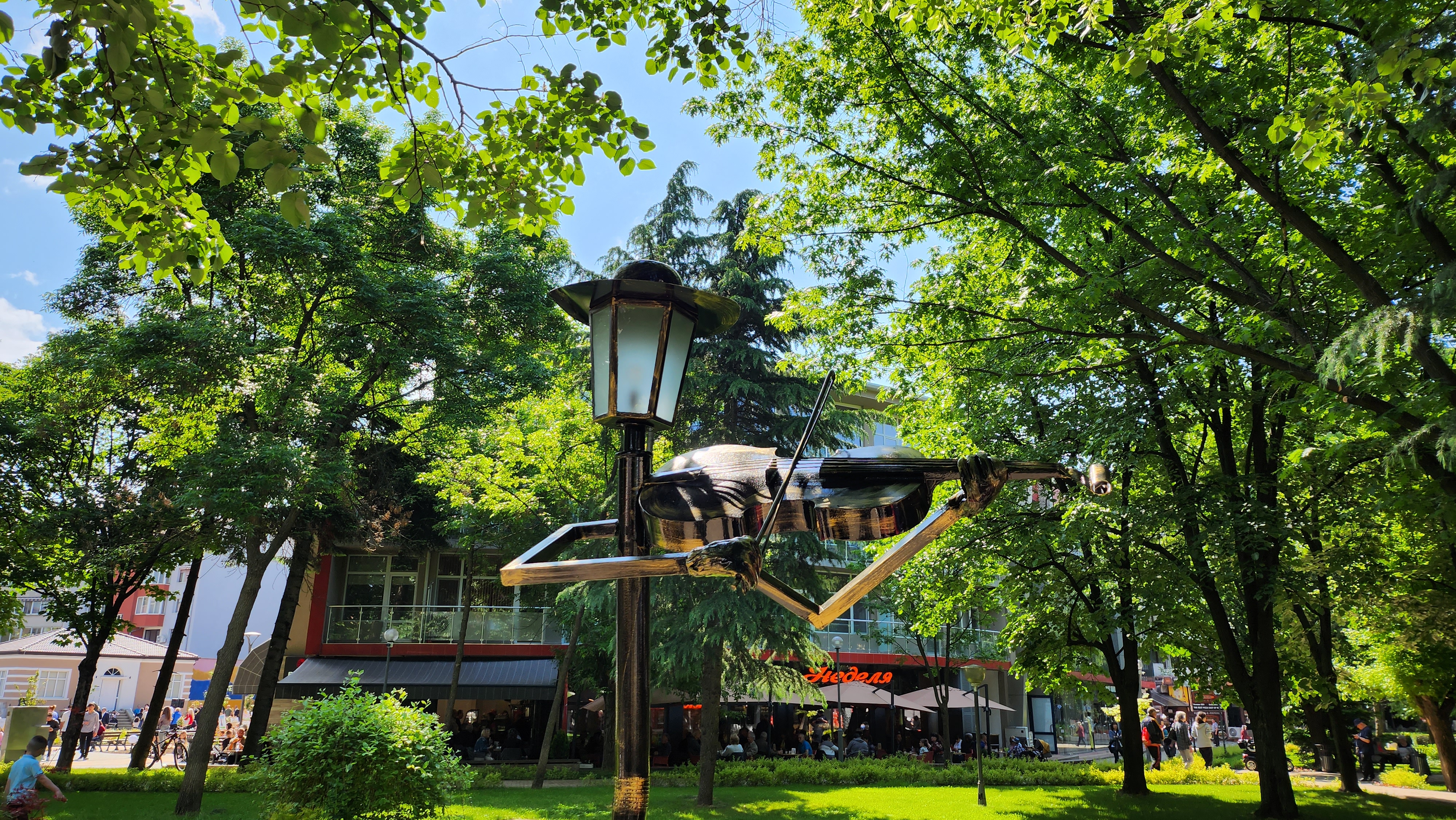 Violin sculpture on a lamp post in Kazanlak