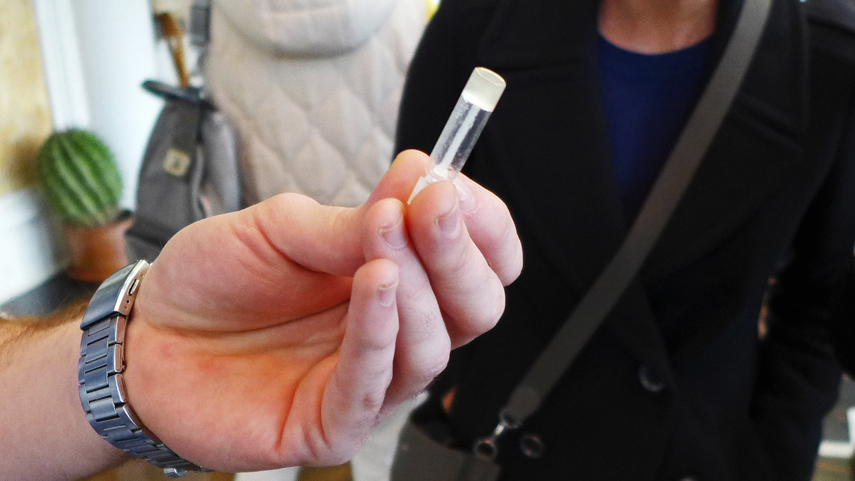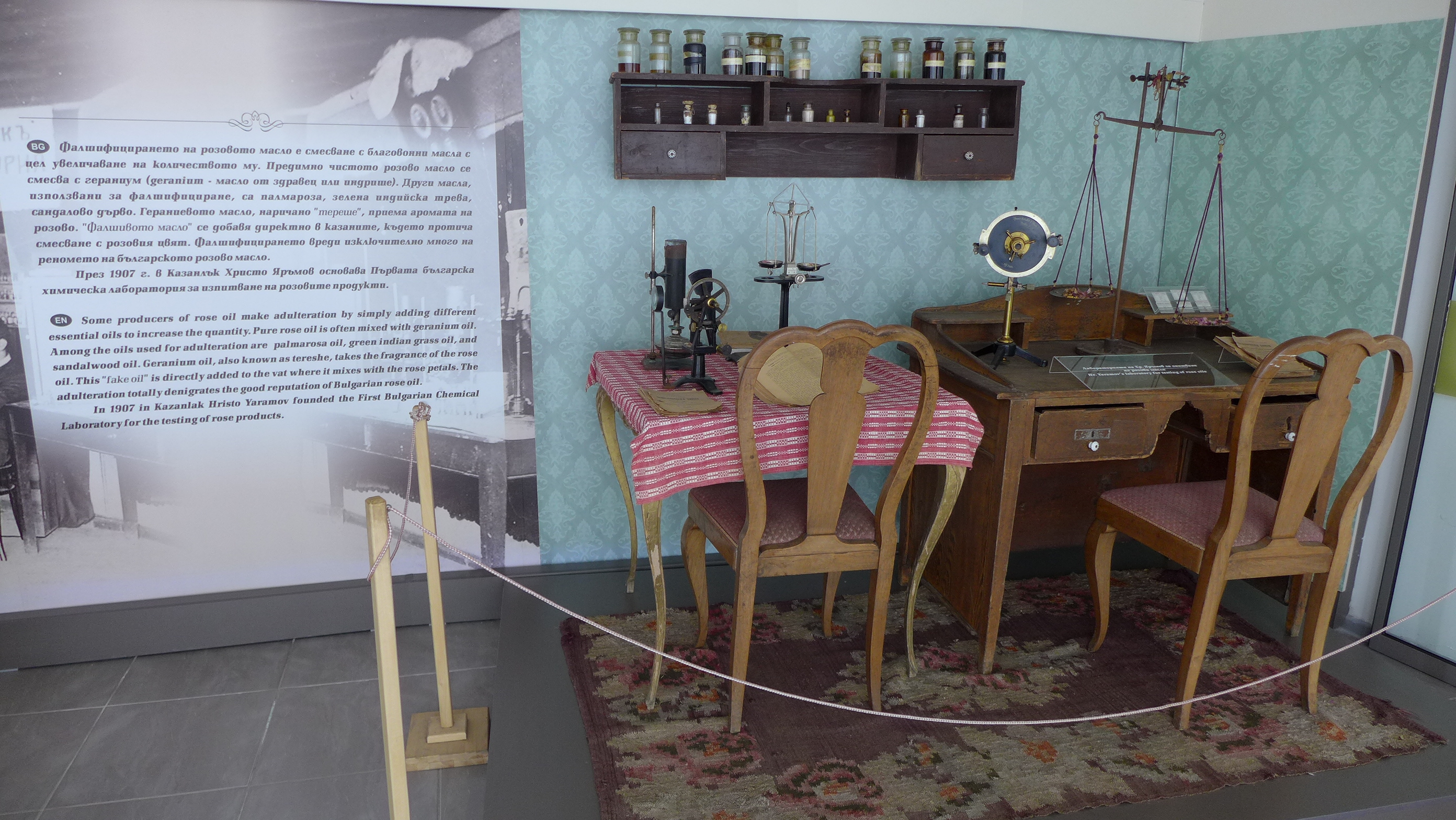 We were shown a “crystal” of pure rose oil, which is formed by cooling the oil to below 18 degrees Celsius (~64 degrees Fahrenheit). This can be used as a simple test of rose oil purity—if it does not congeal at this temperature, it is most likely adulterated.