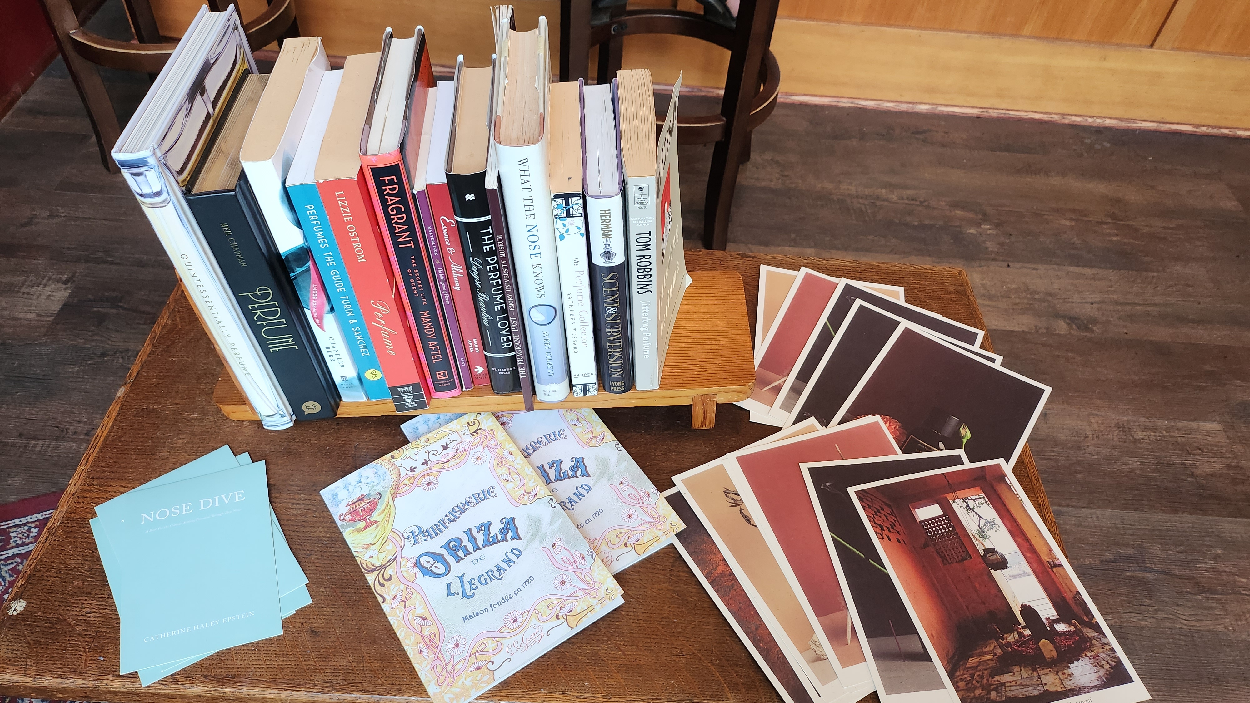 While my other half plopped himself down on a cozy chair in front of a full selection of perfume-related books, I got lost in the visual sea of bottles on the wall and couldn’t decide what to ask to try. Finally I picked up Ormonde Jayne Sakura from the counter and sprayed it on my other arm (that didn’t already have ice cream perfume on it). That is one I’d been interested in for a while. It was indeed very pretty, and familiar… I soon realized that it reminded me of Osmanthus from the same brand, but more delicately floral and with less citrus—and, of course, rounded and glossed by Iso E Super in its woody-musk glory.