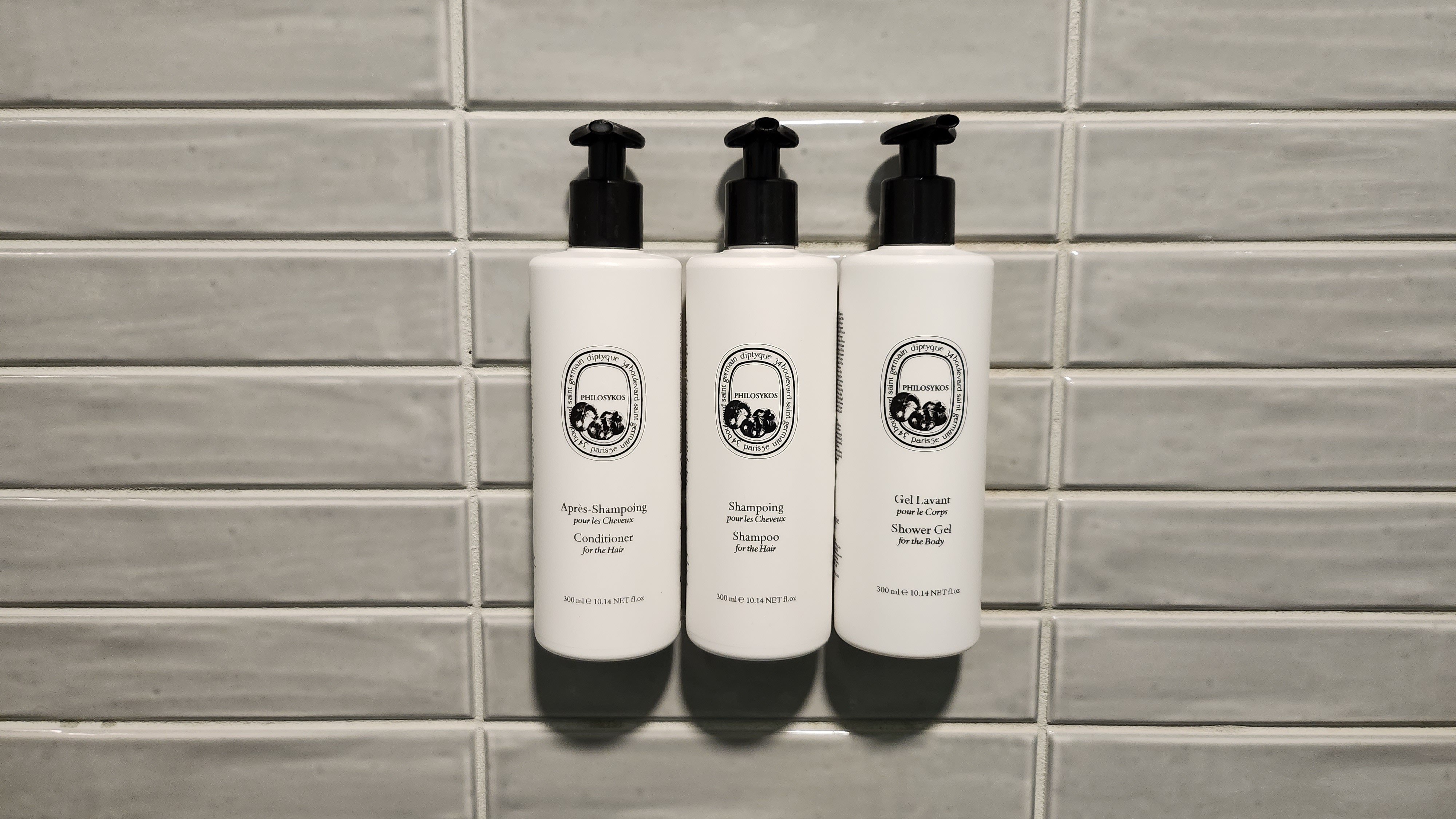 To my great surprise, it had Diptyque toiletries in the bathroom! Philosykos shampoo, conditioner, and body wash, and 34 Boulevard Saint Germain soap and lotion. Such a treat! Coming back down to the lobby, I guessed that the scent might be a version of L’Ombre dans L’Eau, although the person at the front desk didn’t know.