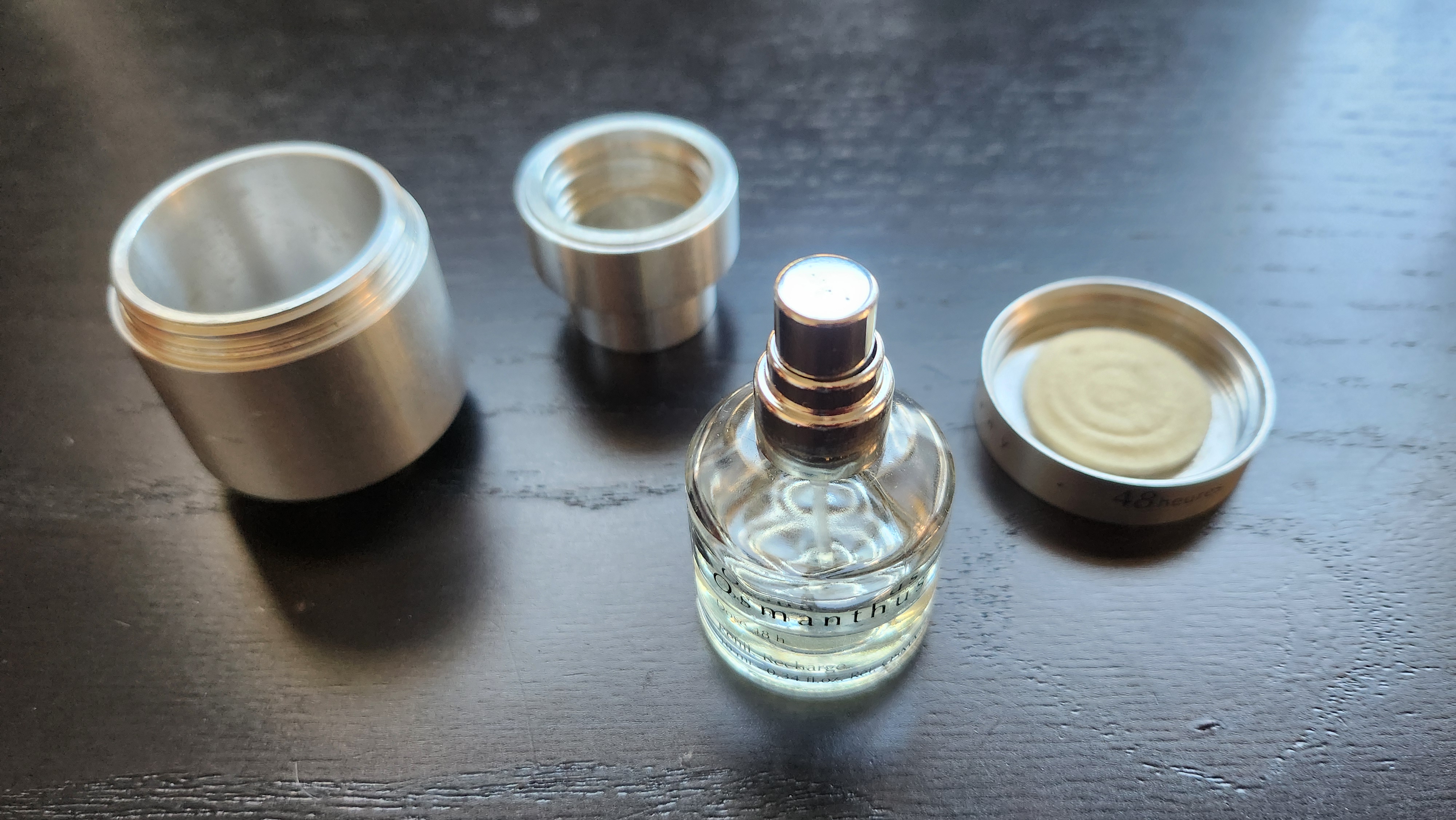 This last phrase is probably what truly spurred my search in earnest, as apricot and leather are the facets I wish were more prominent in many osmanthus perfumes. Still, I wouldn’t have bought a full bottle without knowing how it smelled. Luckily, a perfect compromise greeted me upon my search—a used travel bottle at a good price. It was the design of the bottle, or more accurately, the bottle’s container, that sold me on it.