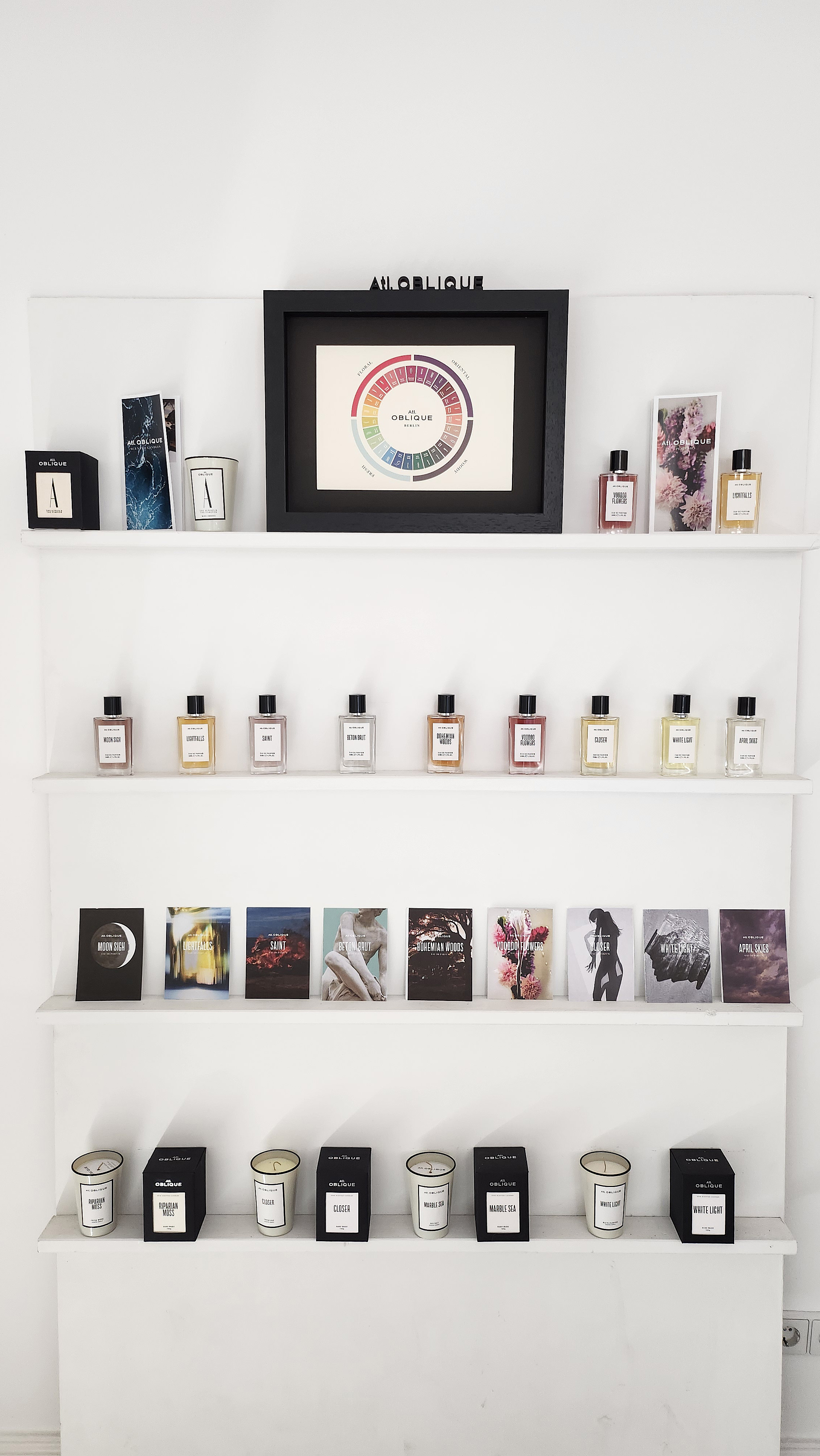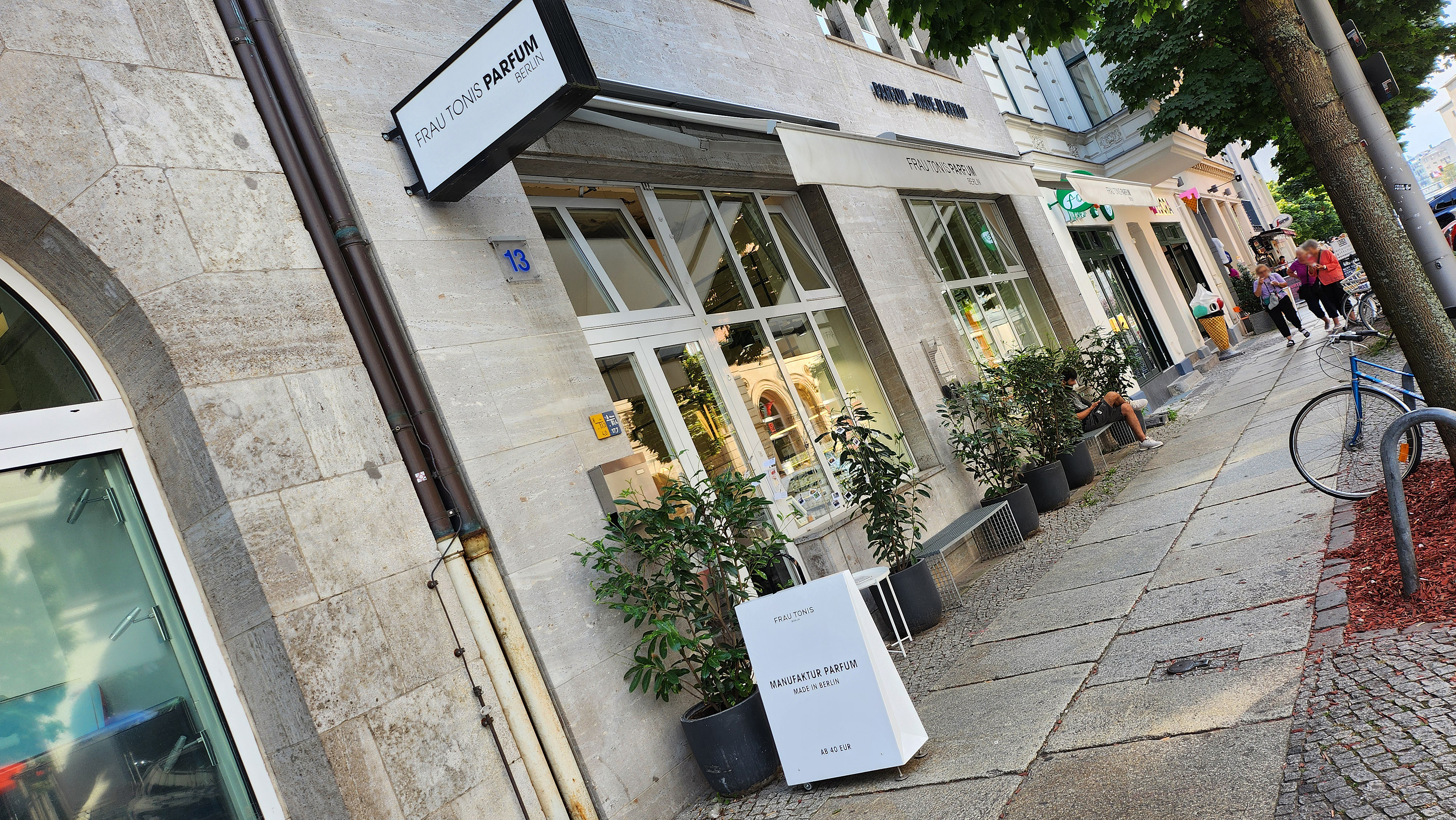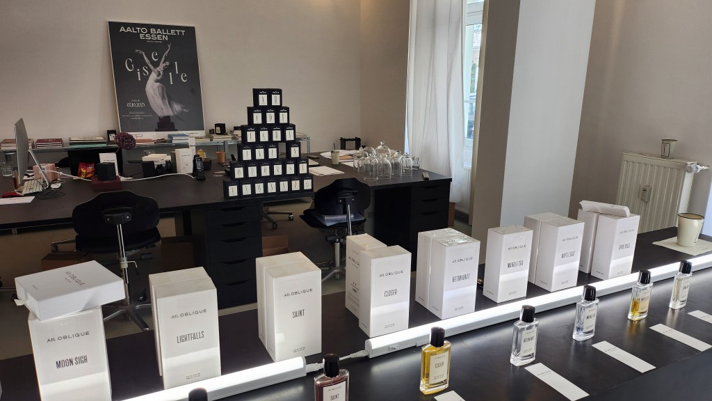 In terms of perfume shopping, Atelier Oblique is a store I sought out because I had read about the brand a few years ago, knew they were based in Berlin, and liked their minimalist aesthetic. I followed the GPS and ended up walking right past them, because I didn’t see the sign on the storefront… because it was covered by two people sitting on the bench in front of it, eating their lunch—one of whom turned out to be the founder and creative director of the brand!