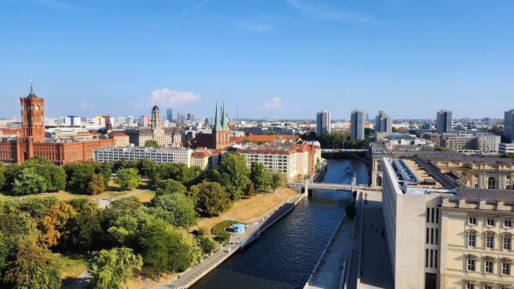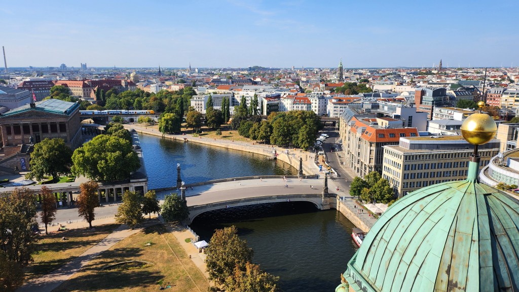 A month ago today, we arrived in Berlin by train from Munich and spent another whirlwind day and a half catching up with another old friend and seeing as much of the city as we could. Our first stop was the Berliner Dom, a very impressive cathedral with a panoramic view along the circumference of the dome. The ascent was 267 steps, relatively easy ones compared with similar attractions in other European cities because they were wide stairs along the sides of the building, unlike the narrow, claustrophobic, spiral staircases found in bell towers. They may have seemed more challenging because we were hungry and overheated, but the view was worthwhile.