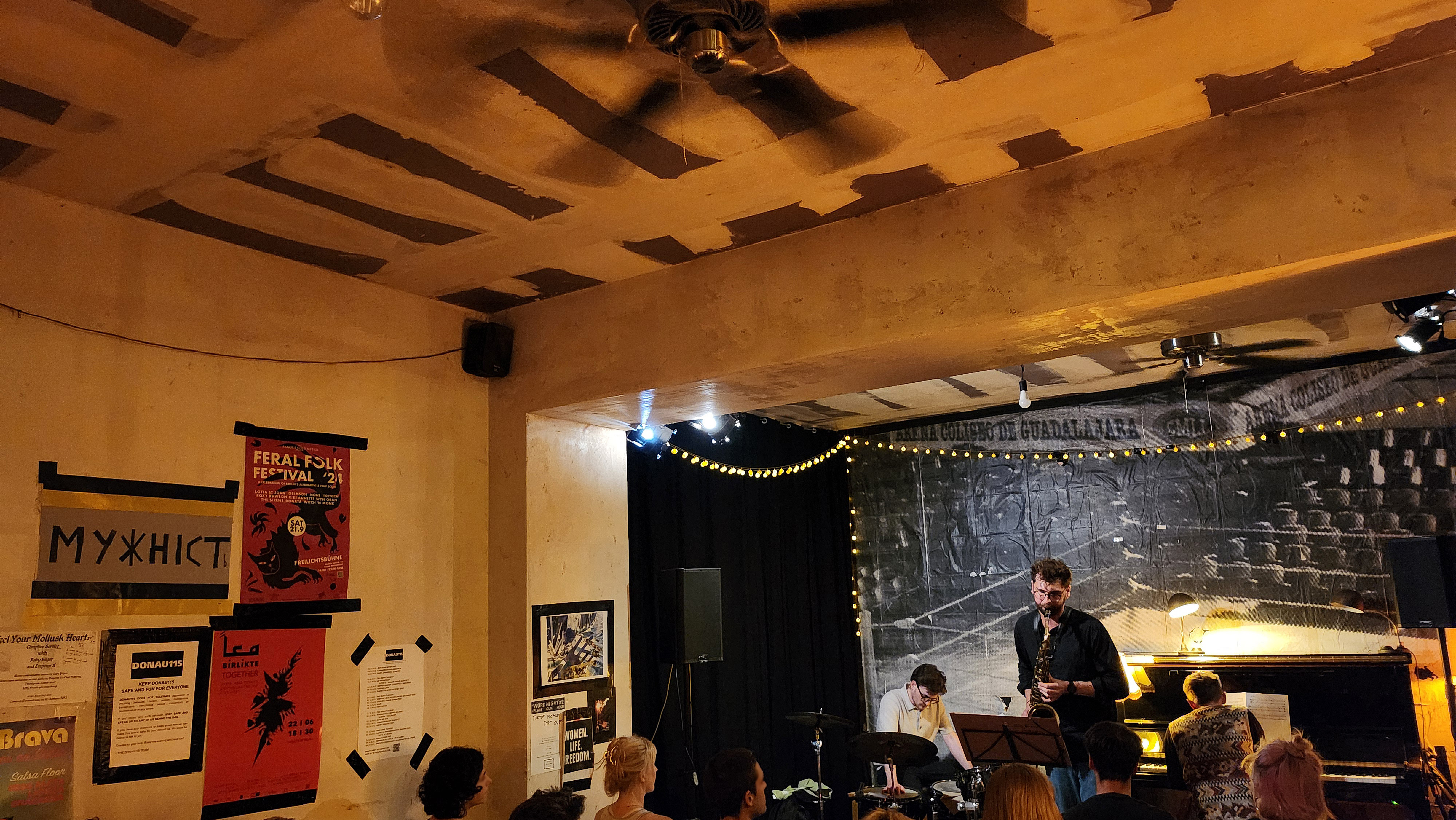 After dinner, my friend took us to the graffitied neighborhoods of the east side to experience another unique (and, sadly, dwindling) aspect of Berlin—experimental jazz bars. Cover charges are a suggested range and we were told that couples, pairs, or groups are preferred while single guests are charged more because the establishments want to deter people from treating them like the kind of bars where they try to pick up strangers. Seating and drinks are very basic, and the point is to enjoy the music, which is all improvised. Art in unadulterated form.