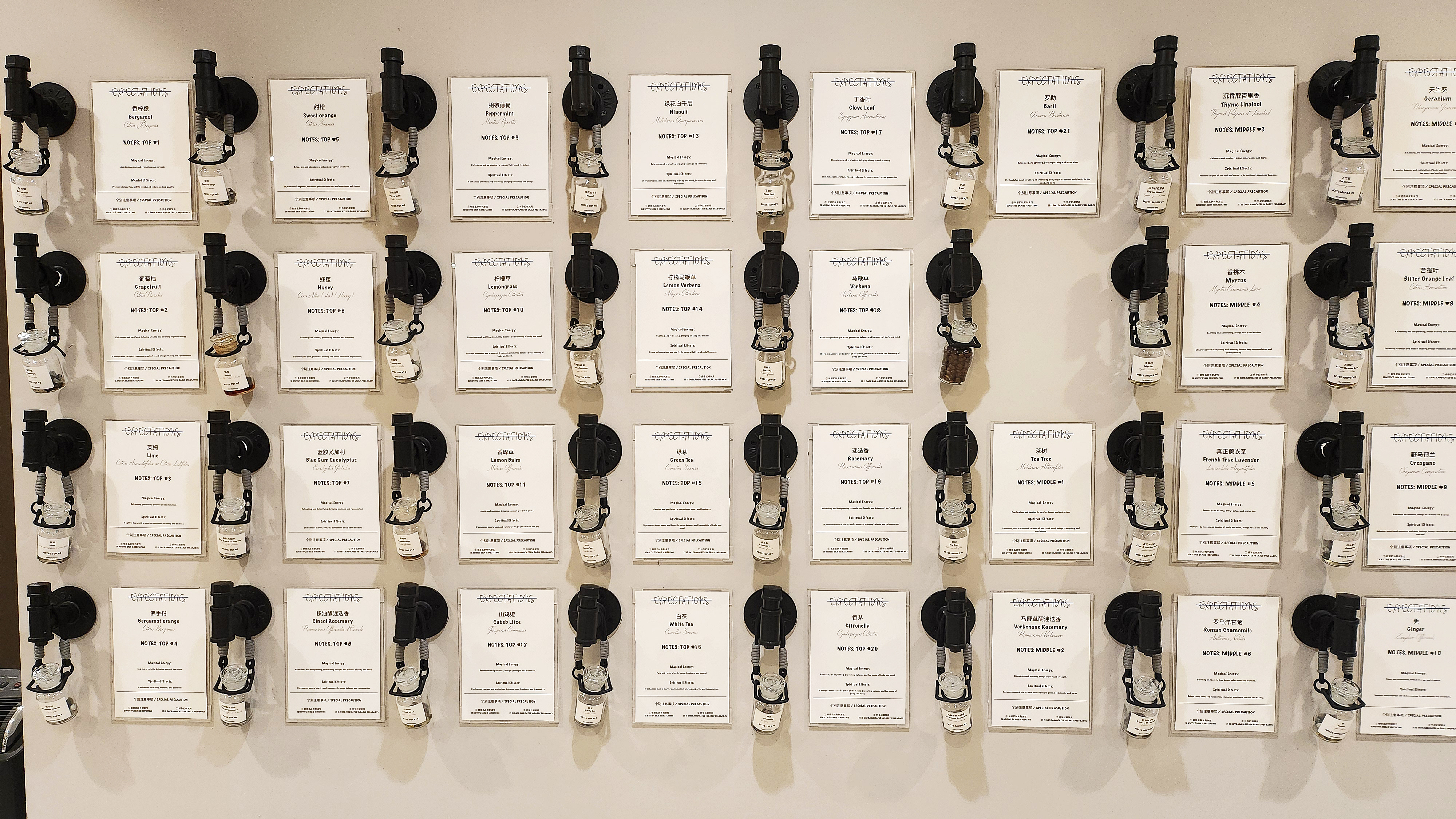 It smelled very nice when I opened the door, as a workshop had just finished, and I started perusing the impressive wall of ingredients. Each is showcased by stones saturated in essential oil, allowing the headspace to scent the cap of the glass flask. While the studio uses synthetic aromachemicals as well for notes that cannot be obtained by natural extraction (such as watermelon or lychee), these are not included on the wall.