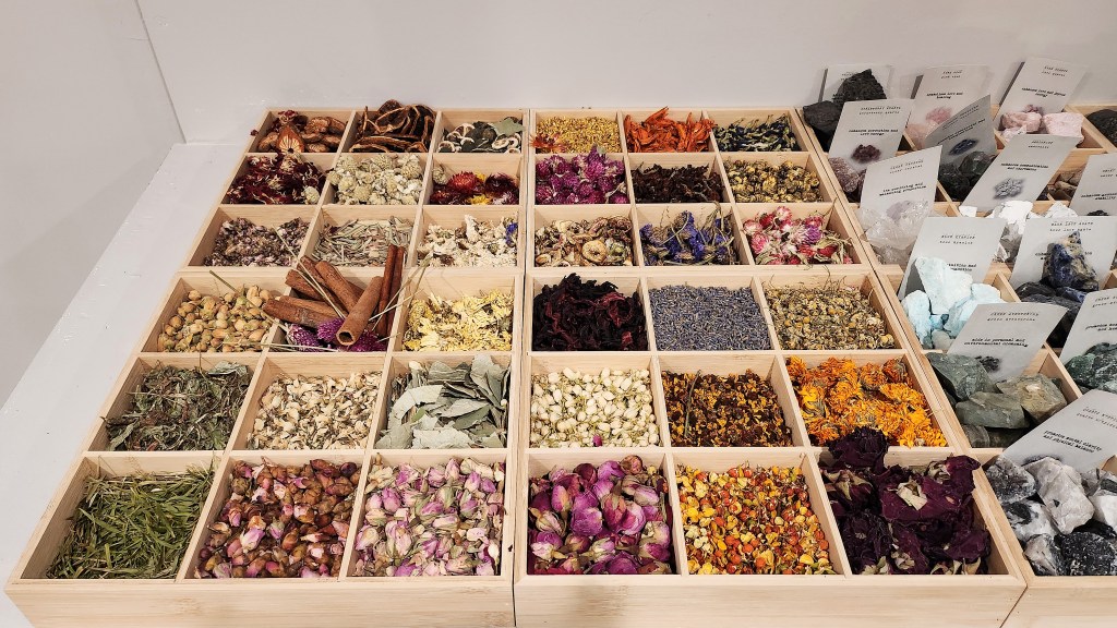 In a blending workshop, clients can choose any number of top, middle, or base note ingredients to create a personal fragrance. Other options include stone diffusers, reed diffusers, and candles. A large selection of dried plants can be added to the soy wax candles if desired.
