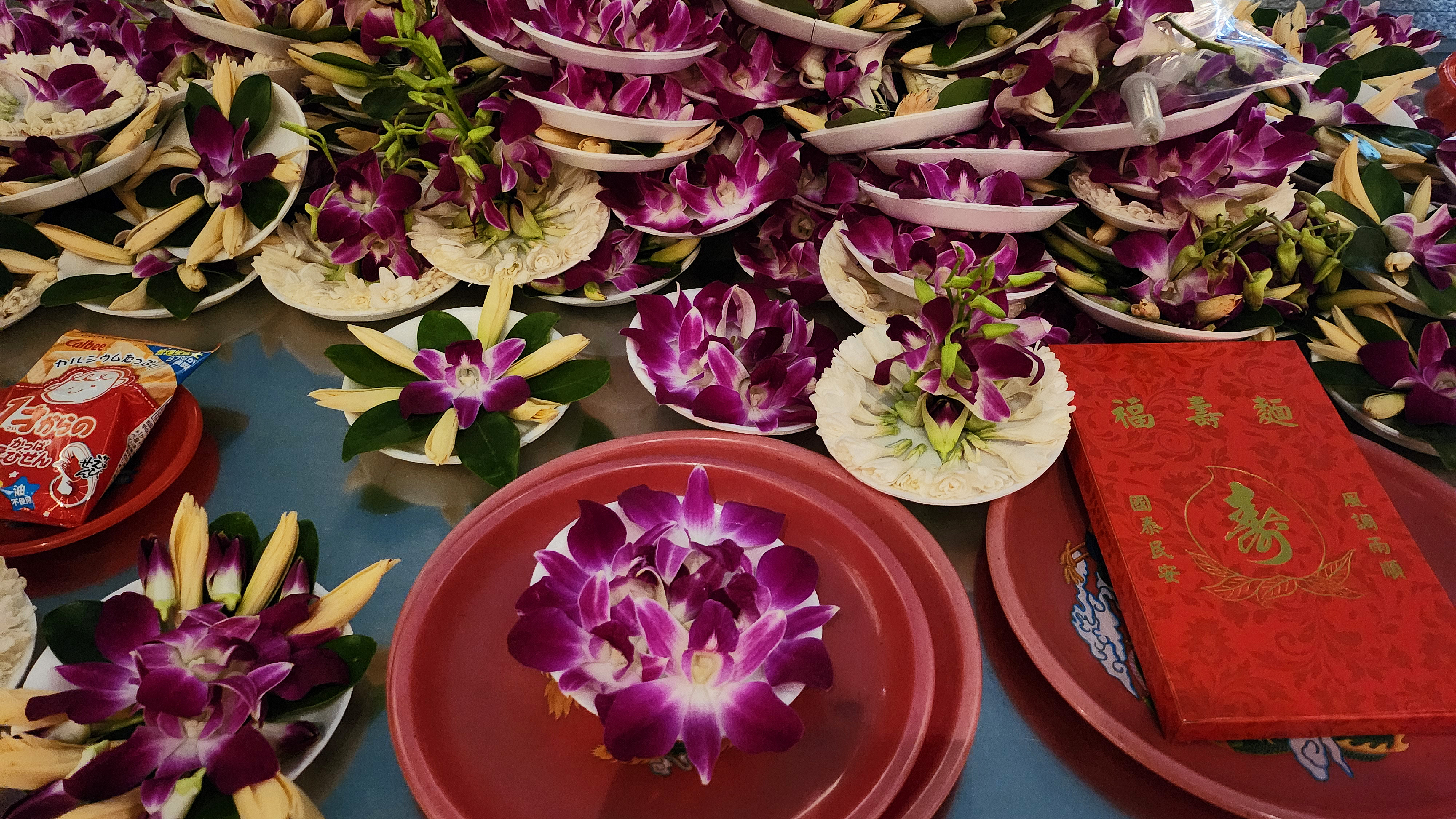 Naturally, the fragrance of incense and smoke pervades temple surroundings, but Lungshan Temple presented another diffusive scent just as heady—that of flowers literally piled up as offerings alongside food products. (Several generations ago, the custom was to cook a feast to offer to the gods and ancestors, and the people would eat it afterwards, but now they just place nonperishable foods in their original packaging on the table. I grew up hearing the joke that the gods had to work harder these days for their meals in the otherworld!)