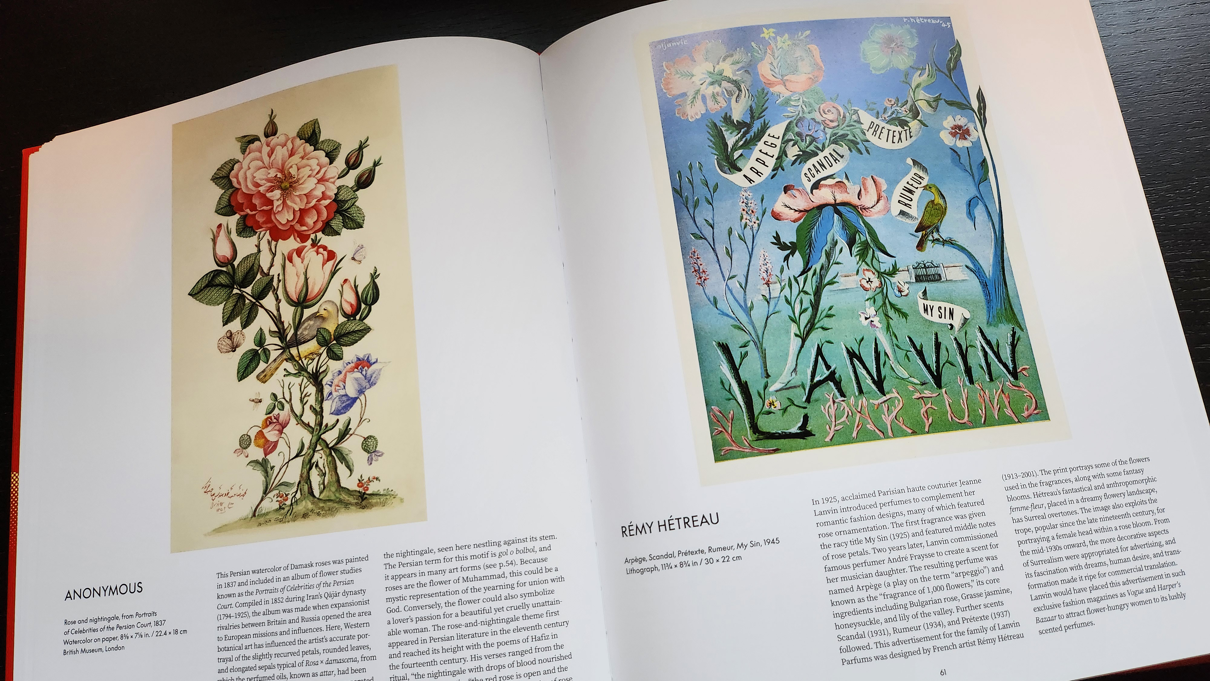 The hard cover and spine are textured, with the letters of the title debossed. The vibrant colors promise more captivating visuals inside. For us perfume lovers, Victoria Gaiger has written an essay entitled “The Scent of the Rose,” tracing the history of the flower in perfumery and detailing the process of its harvest and extraction.
