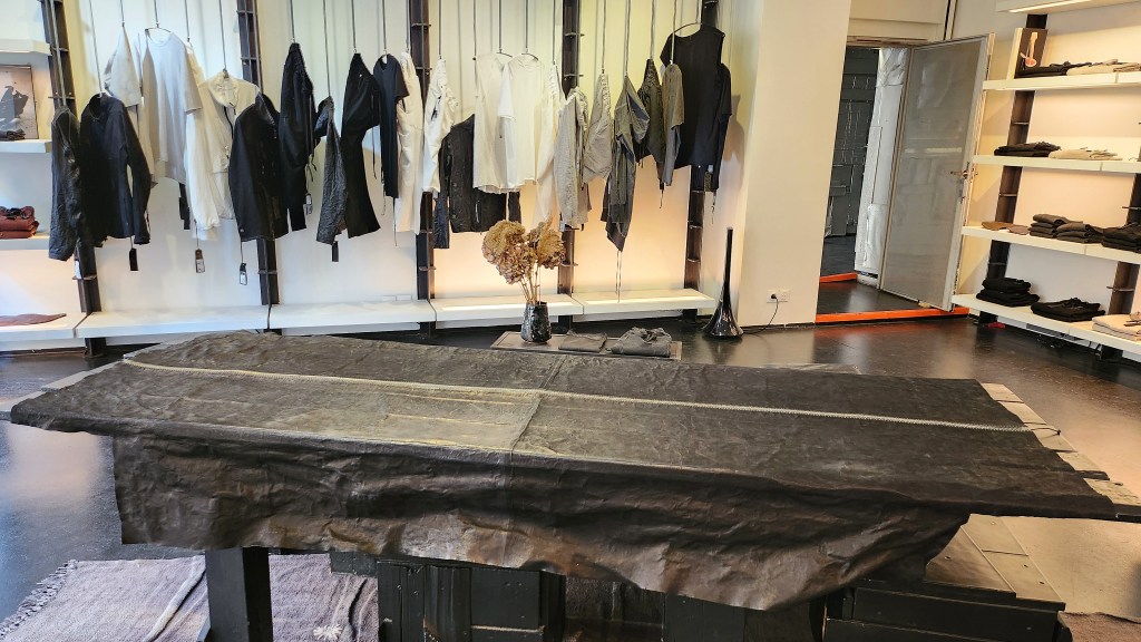 L’Eclaireur also has a popup space at the front, and they rotate brands every three months. Right now through the end of July, it’s Isaac Sellam Experience, whose eponymous founder is continuously innovating with leather—he has worked with translucent, reflective, and thermoreactive leathers, and making wavy textures in stretch leather, for example. The store had a characteristic scent, almost like a cool iris, that presumably emanated from some of the leather jackets.