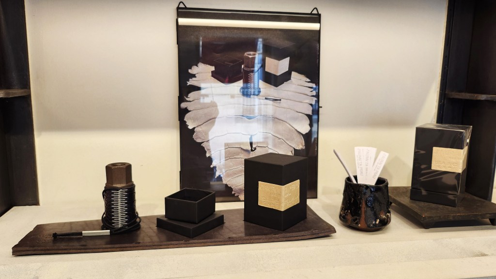 They also have a fragrance called J’Aurai Ta Peau (“I will have your skin,” which sounds morbid, but apt for a leather atelier), which my other half immediately recognized as leather but which smelled more strongly metallic to my nose. Listed notes are leather (!), ginger, elemi, musk, oud, and guaiac wood. I was kindly given a sample, so will be spending more time parsing it.