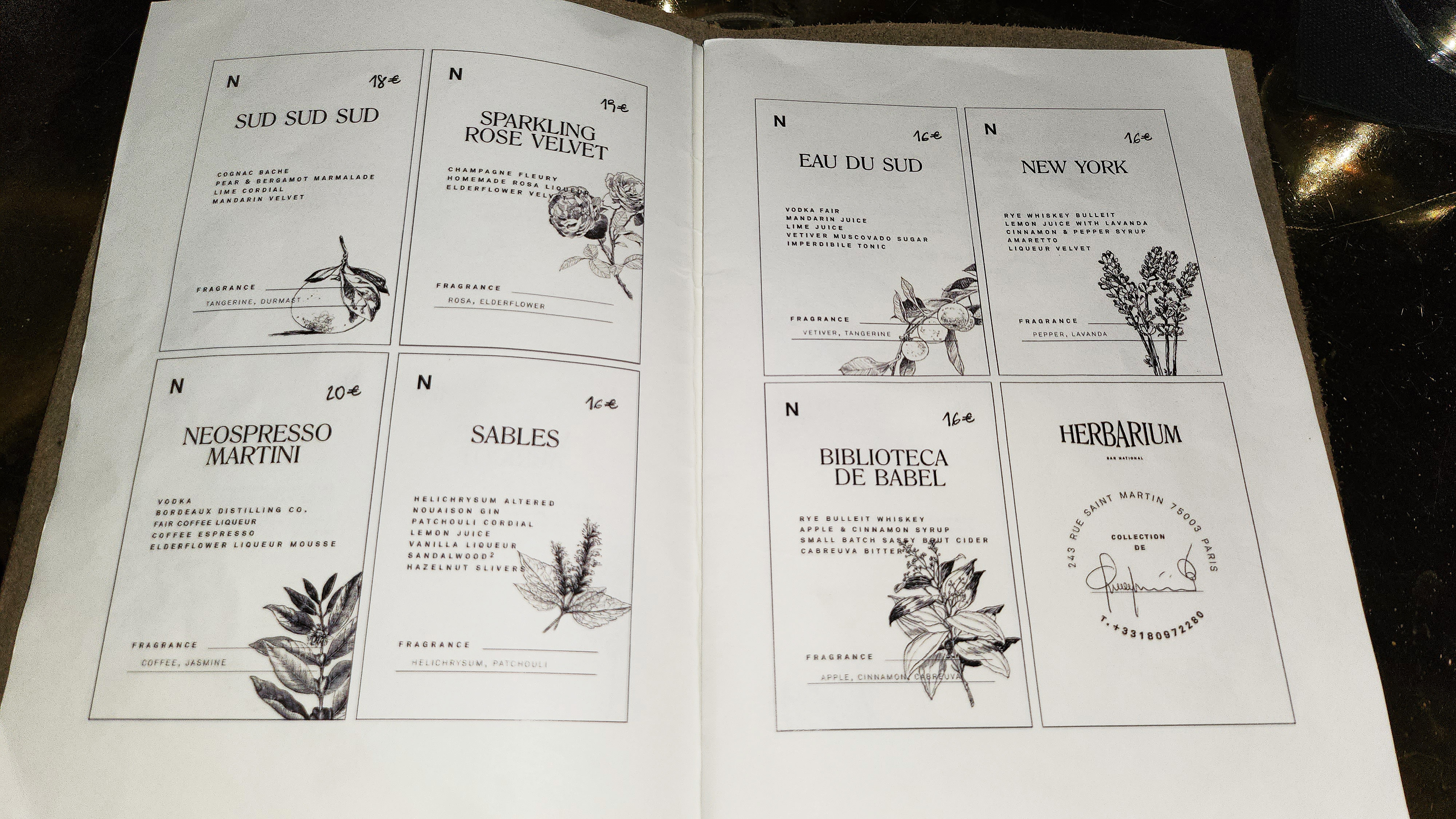 My other half joined us for dinner, marking the start of his vacation, and afterwards, we all headed to L’Herbarium. I had found this cocktail bar by searching online for perfume cocktails in Paris. When we arrived at the Hôtel National des Arts et Métiers, my friend remembered she’d been to the bar there before and it wasn’t very good… my heart sank a little, until she realized it was a different bar in the same hotel!