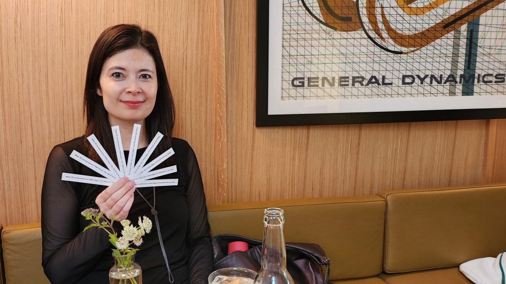 The people in the shop were busy, so we sniffed on our own. Each fragrance is soaked in gauze contained in a tea cup, arranged in the order depicted on a placard. This way, one can either smell something specific or without knowing what it is. Some testers are also available to spray (or are kept behind the “bar”). I tried Obvious Milk & Matcha, which we found mostly sweet and vanillic, and my friend really liked Les Liquides Imaginaires Sancti, with its drier notes of cypress, herbs, and incense.